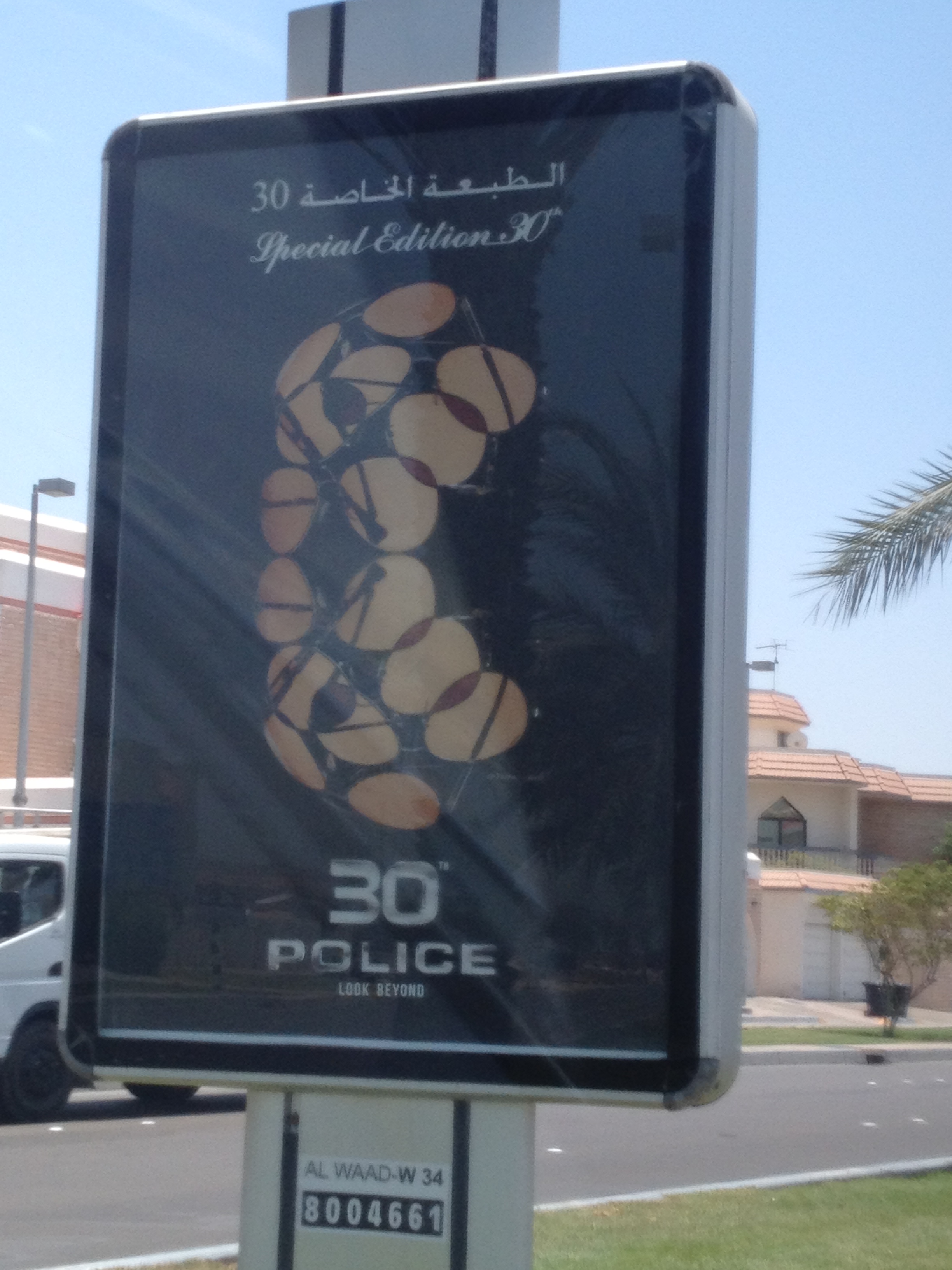 So, today, I made up my mind I was going to get a picture and figure this out. Since I came home at a time when the road isn’t so busy, I used my hazard lights to ward off cars and finally got a picture. Upon closer inspection, I realized that it was not 3D, but 30. If I had been able to read the top of the sign earlier, I might have made that connection sooner. So, that confirmed it was indeed a sign for the Police brand sunglasses. I finally realized that perhaps the image was the sunglasses, but it just wasn’t coming to me.
